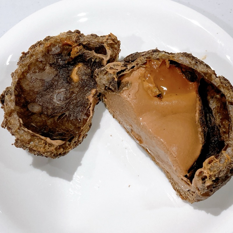 中のキャラメルソースはねっとりしたとろけるような質感で、ビター寄りなキャラメル味で後から苦味が押し寄せて来る感じ。